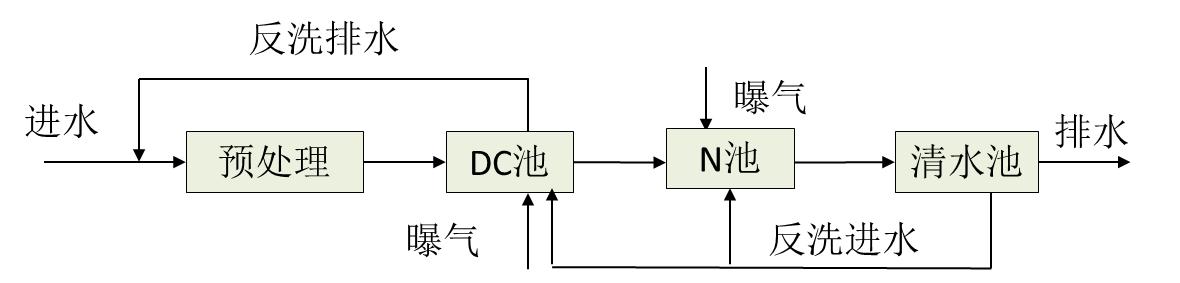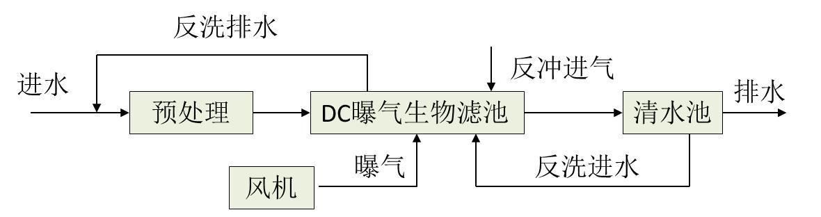 工藝流程:預(yù)處理過(guò)程去除大顆粒懸浮物——DC曝氣生物濾池降解有機(jī)物——排水