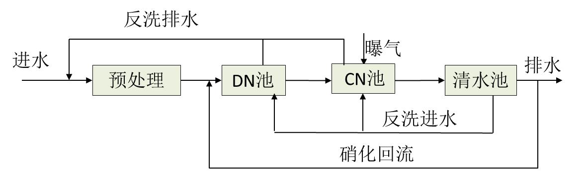 流程說(shuō)明:DC曝氣生物濾池去除90%以上有機(jī)污染物——N曝氣生物濾池進(jìn)行硝化作用——排水