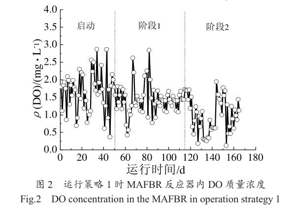 運行策略 1 時,MAFBR 反應器內 DO 質量濃度變化如圖 2 所示??梢钥闯?,啟動、階段 1 和階段2COD 進水負荷略有增加,氨氮進水負荷明顯提高,因此 3 個階段反應器內 DO 質量濃度逐漸下降,DO平均質量濃度分別為 1.65、1.43、0.88 mg/L。
