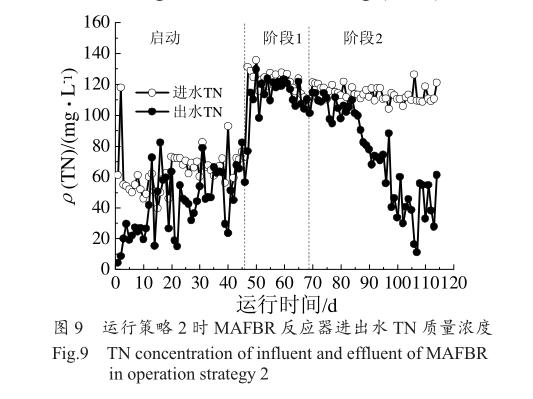 運行策略 2 時,MAFBR 反應器進出水 TN 質量濃度變化如圖 9 所示,其中階段 1 和階段 2 進水TN 質量濃度同樣比啟動階段提高約 1 倍,降低 C/N比為 1.0??梢钥吹?,啟動運行 15 d 后,啟動、階段 1和階段 2 出水 TN 質量濃度分別為 50.70、113.46、74.47 mg/L;去除率分別為 22.63%、6.97%、34.64%;去除負荷分別為 0.06、0.03、0.16 kg/(m 3 ·d)。同樣值得注意的是,階段 2 運行至 98 d 后,TN 去除性能明顯改善,出水 TN 平均質量濃度、去除率和去除負荷分別為 40.43 mg/L、63.93%和 0.29 kg/(m 3 ·d)。