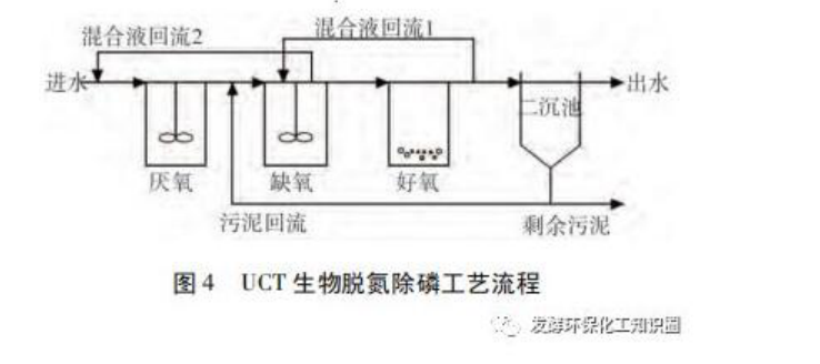 UCT工藝適用于處理 BOD5/TN或BOD5/TP較低的城市污水,當(dāng)污水C/N<4、C/P <20時,UCT工藝比普通A2O工藝具有更高的除磷效率,UCT工藝增加了從缺氧段出流液到厭氧段的回流,增加了能耗,且兩套混合液回流交叉不利于控制缺氧段的水力停留時間。