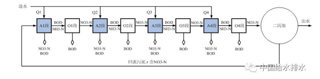 該工藝由二至五個(gè)串聯(lián)A/O組成,圖中以四段AO為例,回流污泥從首端進(jìn)入,污水按一定比例從每個(gè)A段進(jìn)入,為反硝化提供碳源,剩余的碳污染物在O段去除,氨氮?jiǎng)t氧化成硝態(tài)氮進(jìn)入A段處理。工藝具有以下特點(diǎn):