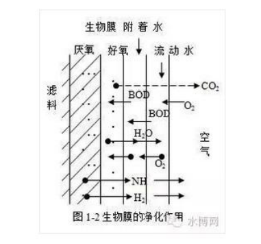 生物膜(好氧層+兼氧層+厭氧層)+附著水層(高親水性)。